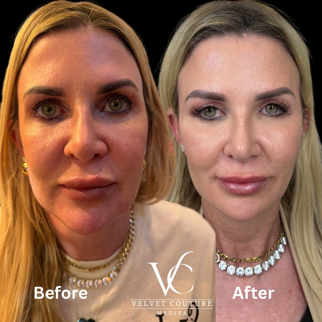 The Velvet Lip + Chin Sculpt enhances the profile and refines facial proportions by combining strategic chin filler with Velvet Lip Plush enhancement. This treatment elongates the lower face, improves symmetry, defines the profile, and creates a beautifully balanced, feminine look — the ultimate Velvet Couture transformation.